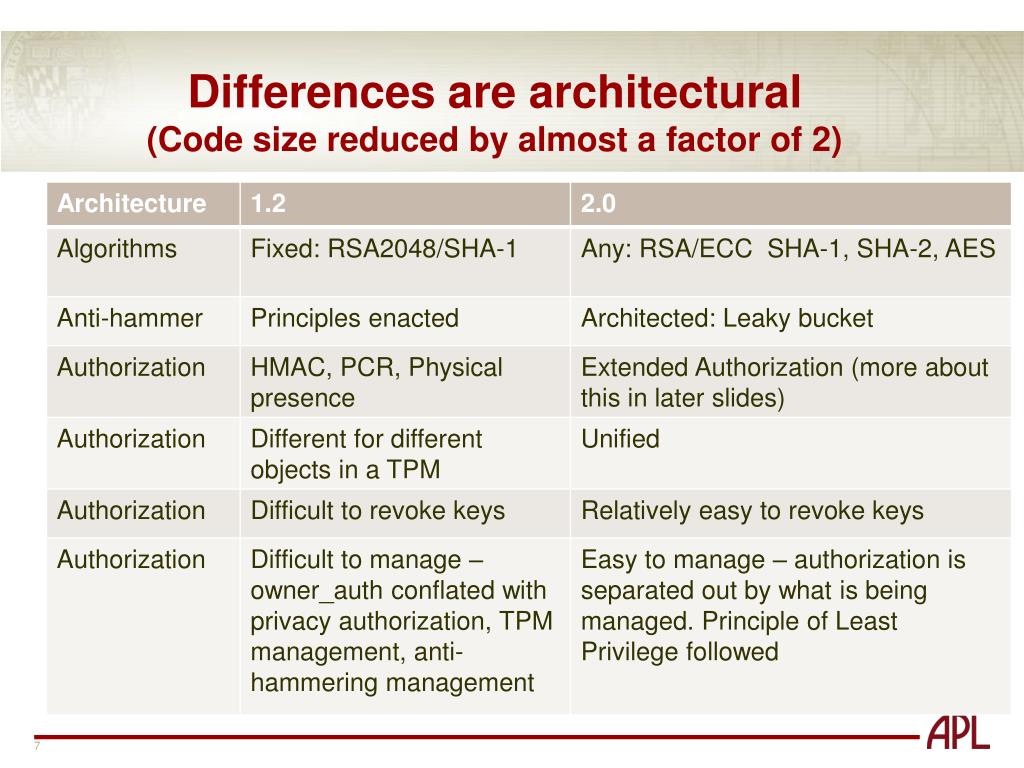 Outline • How TPM 1.2 and 2.0 are the same • How TPM 1.2 and 2.0 are different • Algorithms • Hierarchies • Extended Authorization • PCR Brittleness • Sessions • Working with the Spec • New Use Cases