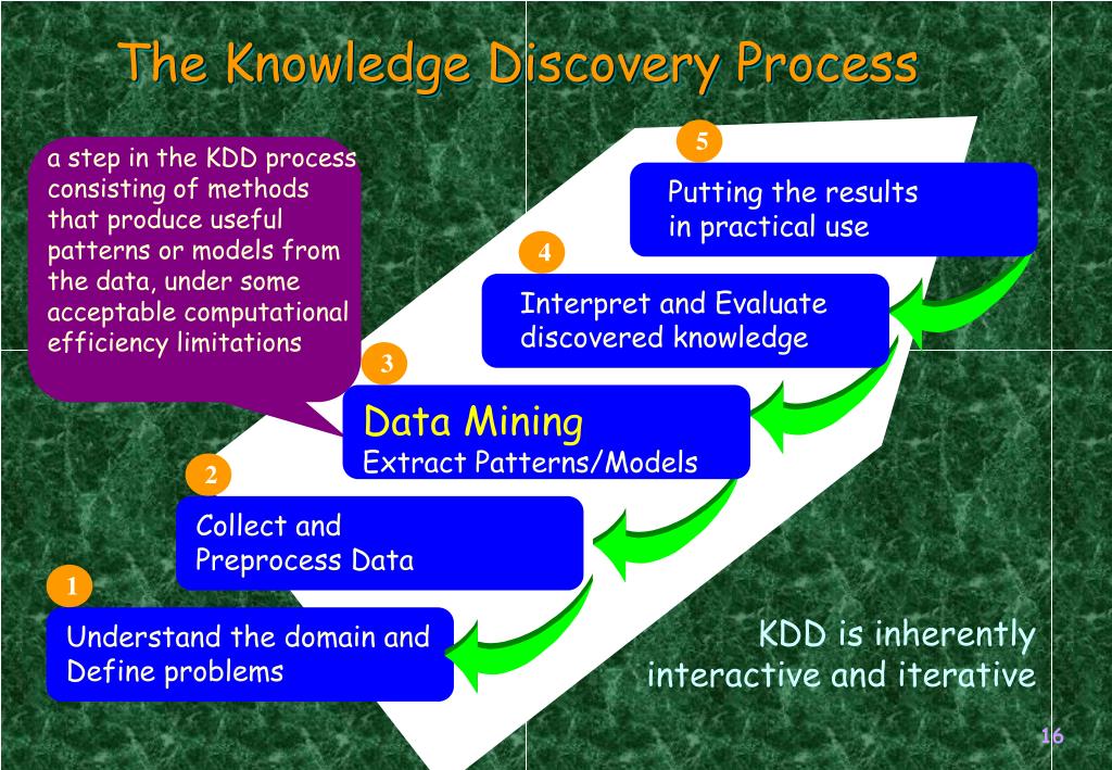 Understand the domain and Define problems Collect and Preprocess Data Data Mining Extract Patterns/Models Interpret and Evaluate discovered knowledge Putting the results in practical use The Knowledge Discovery Process 5 a step in the KDD process consisting of methods that produce useful patterns or models from the data, under some acceptable computational efficiency limitations 4 3 2 1 KDD is inherently interactive and iterative