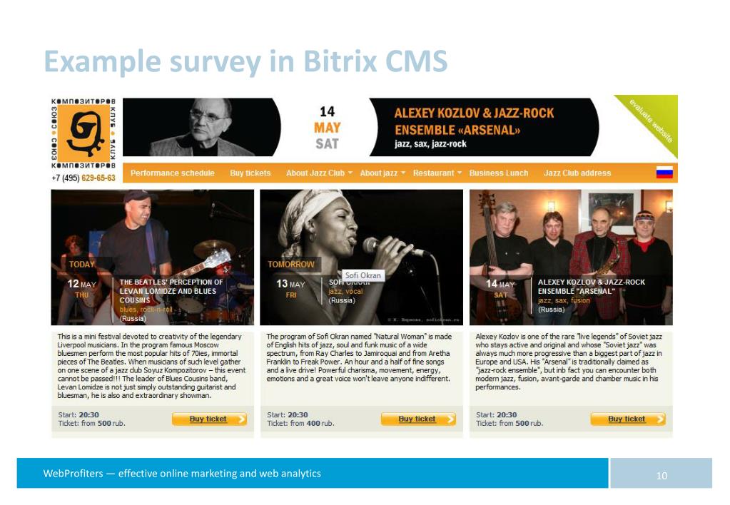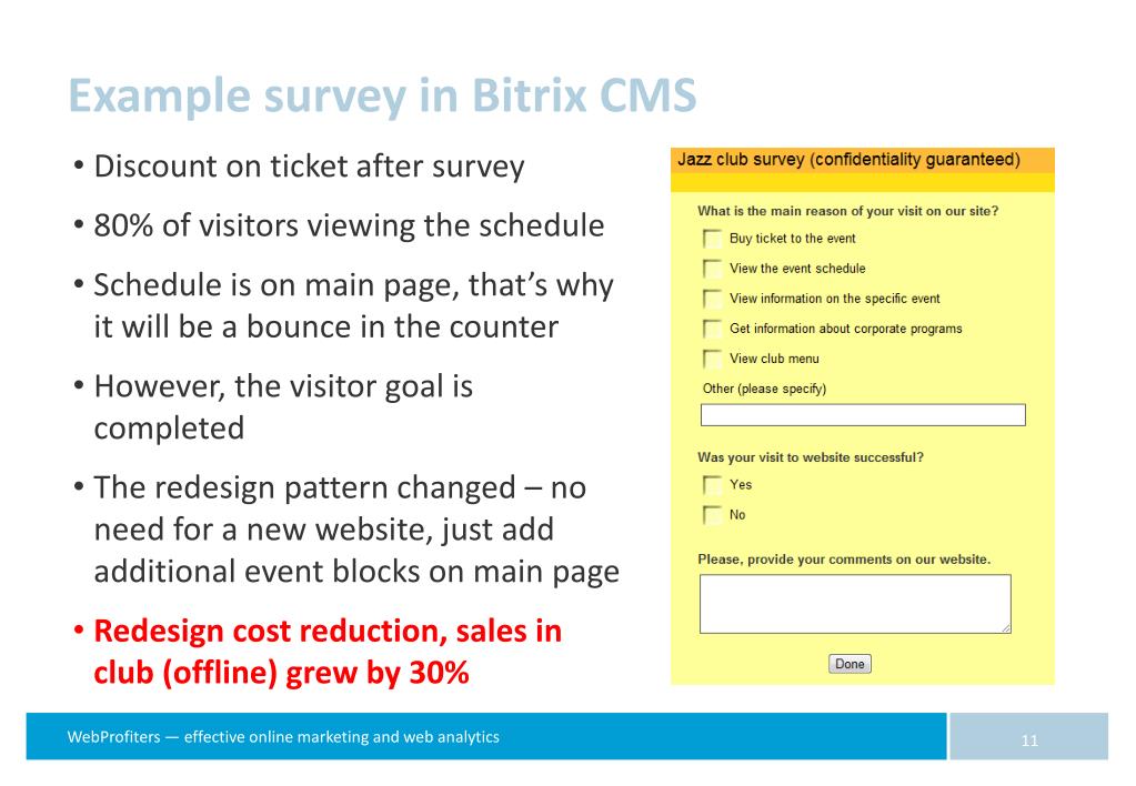 Example survey in Bitrix CMS Discount on ticket after survey 80% of visitors viewing the schedule Schedule is on main page, that’s why it will be a bounce in the counter However, the visitor goal is completed The redesign pattern changed – no need for a new website, just add additional event blocks on main page Redesign cost reduction, sales in club (offline) grew by 30%