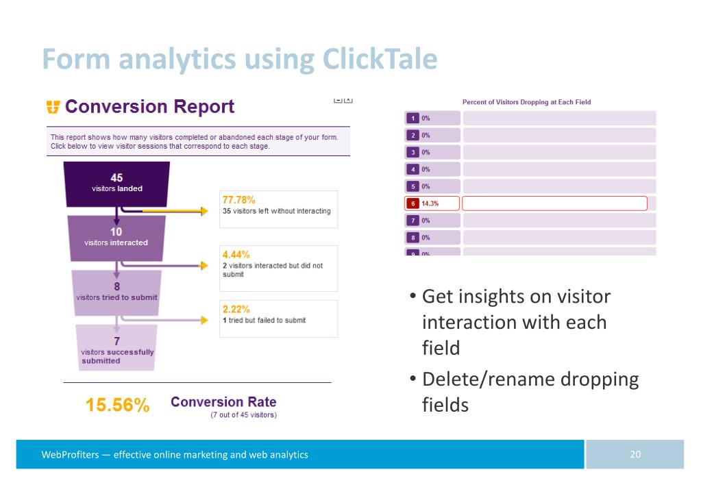 Form analytics using ClickTale • Get insights on visitor interaction with each field • Delete/rename dropping fields