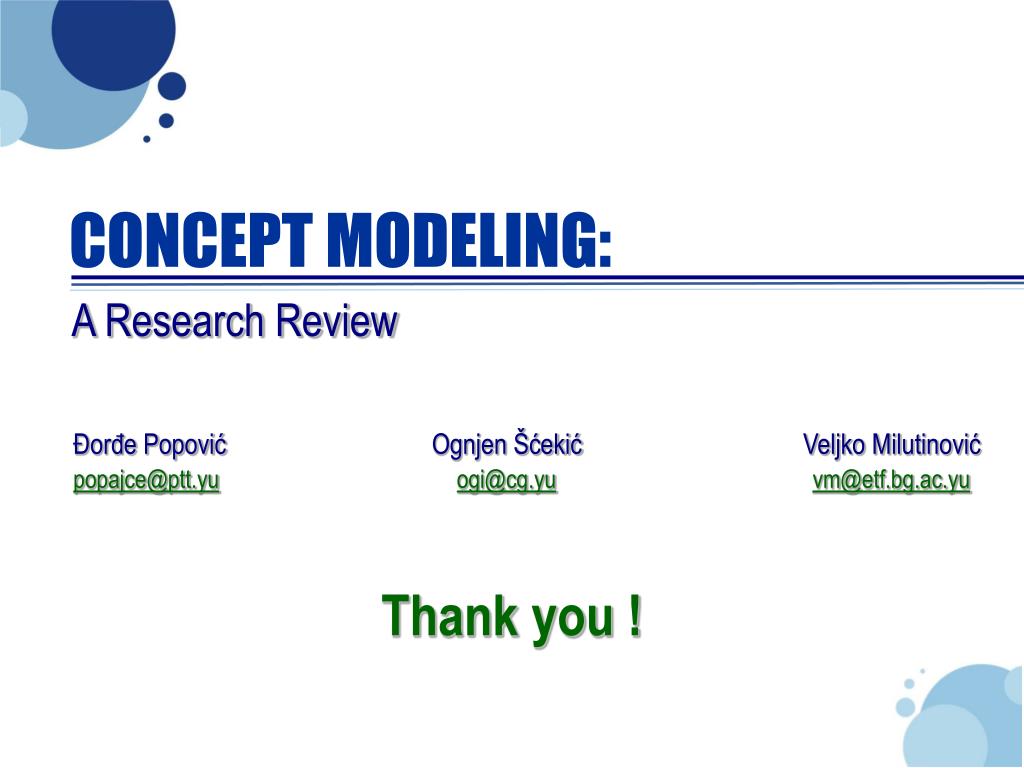 CONCEPT MODELING: A Research Review Đorđe PopovićOgnjen ŠćekićVeljko Milutinovićpopajce@ptt.yuogi@cg.yuvm@etf.bg.ac.yu Thank you !