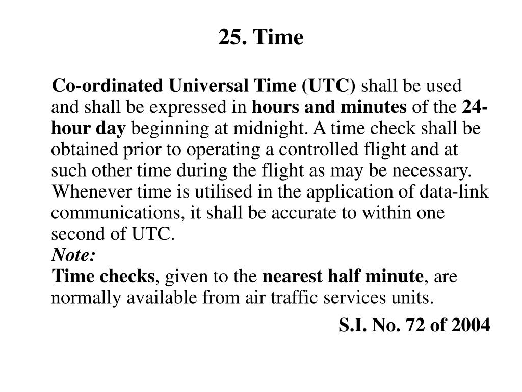 25. Time Co-ordinated Universal Time (UTC) shall be used and shall be expressed in hours and minutes of the 24-hour day beginning at midnight. A time check shall be obtained prior to operating a controlled flight and at such other time during the flight as may be necessary. Whenever time is utilised in the application of data-link communications, it shall be accurate to within one second of UTC. Note: Time checks, given to the nearest half minute, are normally available from air traffic services units. S.I. No. 72 of 2004