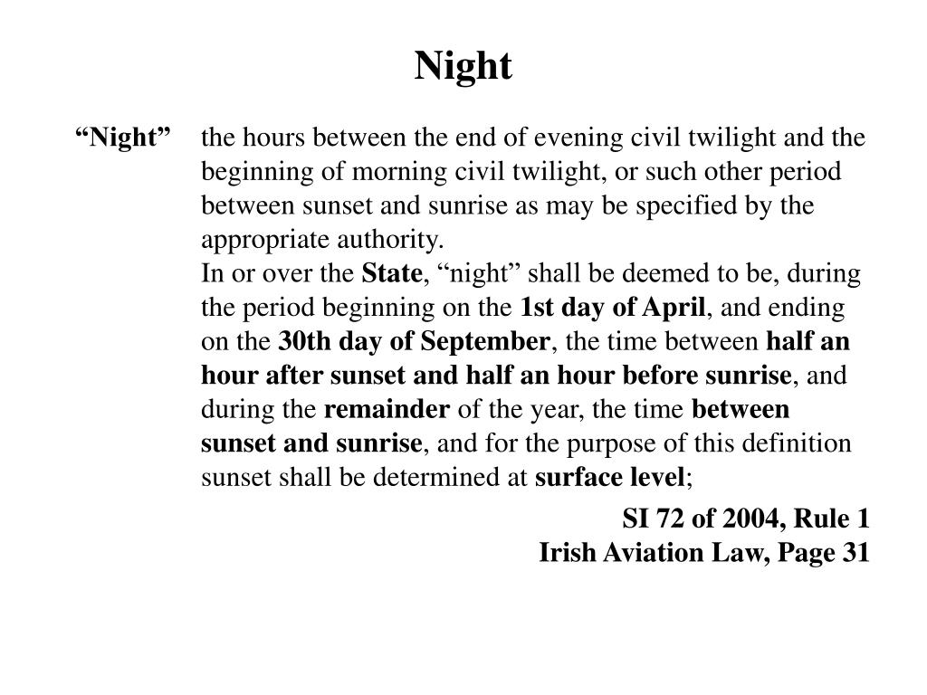 Night “Night” the hours between the end of evening civil twilight and the beginning of morning civil twilight, or such other period between sunset and sunrise as may be specified by the appropriate authority. In or over the State, “night” shall be deemed to be, during the period beginning on the 1st day of April, and ending on the 30th day of September, the time between half an hour after sunset and half an hour before sunrise, and during the remainder of the year, the time between sunset and sunrise, and for the purpose of this definition sunset shall be determined at surface level; SI 72 of 2004, Rule 1 Irish Aviation Law, Page 31