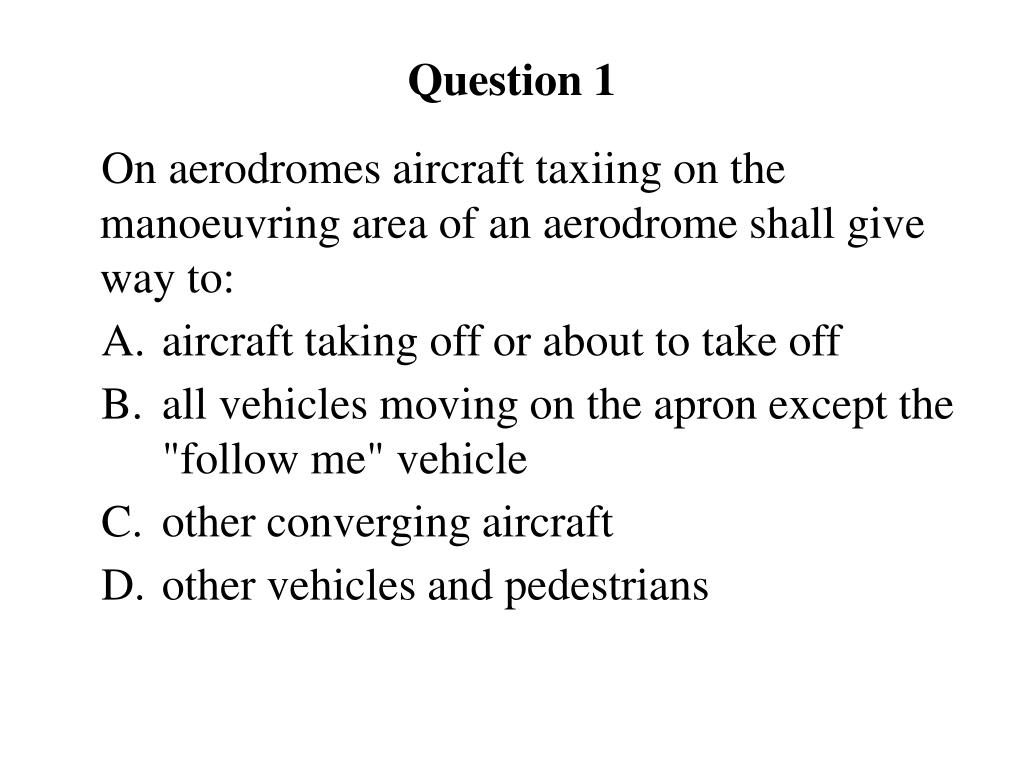 Question 1 On aerodromes aircraft taxiing on the manoeuvring area of an aerodrome shall give way to: • aircraft taking off or about to take off • all vehicles moving on the apron except the "follow me" vehicle • other converging aircraft • other vehicles and pedestrians