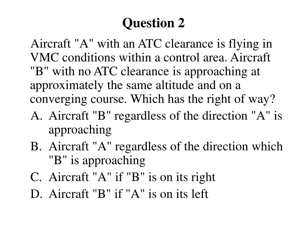 Question 2 Aircraft "A" with an ATC clearance is flying in VMC conditions within a control area. Aircraft "B" with no ATC clearance is approaching at approximately the same altitude and on a converging course. Which has the right of way? • Aircraft "B" regardless of the direction "A" is approaching • Aircraft "A" regardless of the direction which "B" is approaching • Aircraft "A" if "B" is on its right • Aircraft "B" if "A" is on its left