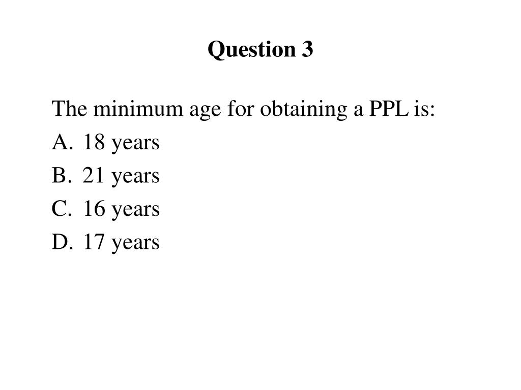Question 3 The minimum age for obtaining a PPL is: • 18 years • 21 years • 16 years • 17 years