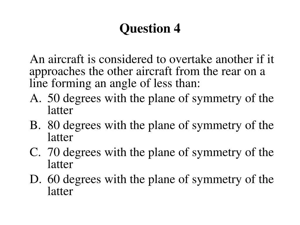 Question 4 An aircraft is considered to overtake another if it approaches the other aircraft from the rear on a line forming an angle of less than: • 50 degrees with the plane of symmetry of the latter • 80 degrees with the plane of symmetry of the latter • 70 degrees with the plane of symmetry of the latter • 60 degrees with the plane of symmetry of the latter