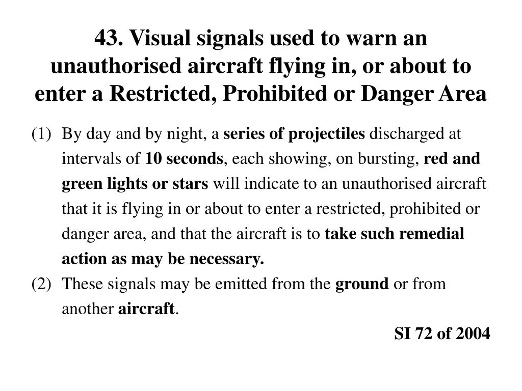 43. Visual signals used to warn an unauthorised aircraft flying in, or about to enter a Restricted, Prohibited or Danger Area (1) By day and by night, a series of projectiles discharged at intervals of 10 seconds, each showing, on bursting, red and green lights or stars will indicate to an unauthorised aircraft that it is flying in or about to enter a restricted, prohibited or danger area, and that the aircraft is to take such remedial action as may be necessary. (2) These signals may be emitted from the ground or from another aircraft. SI 72 of 2004