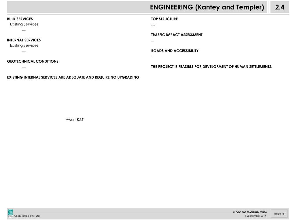 ENGINEERING (Kantey and Templer) 2.4 BULK SERVICES Existing Services • .... INTERNAL SERVICES Existing Services • .... GEOTECHNICAL CONDITIONS • .... EXISTING INTERNAL SERVICES ARE ADEQUATE AND REQUIRE NO UPGRADING Await K&T TOP STRUCTURE .... TRAFFIC IMPACT ASSESSMENT ... ROADS AND ACCESSIBILITY ... THE PROJECT IS FEASIBLE FOR DEVELOPMENT OF HUMAN SETTLEMENTS.