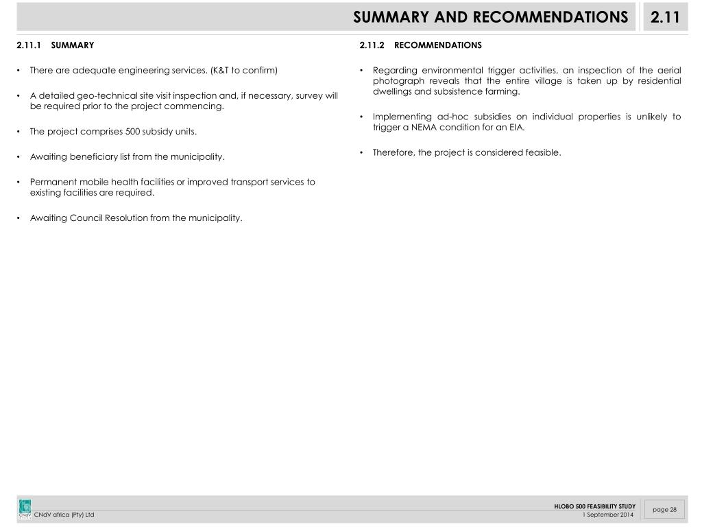 SUMMARY AND RECOMMENDATIONS 2.11 2.11.1 SUMMARY There are adequate engineering services. (K&T to confirm) A detailed geo-technical site visit inspection and, if necessary, survey will be required prior to the project commencing. The project comprises 500 subsidy units. Awaiting beneficiary list from the municipality. Permanent mobile health facilities or improved transport services to existing facilities are required. Awaiting Council Resolution from the municipality. 2.11.2 RECOMMENDATIONS Regarding environmental trigger activities, an inspection of the aerial photograph reveals that the entire village is taken up by residential dwellings and subsistence farming. Implementing ad-hoc subsidies on individual properties is unlikely to trigger a NEMA condition for an EIA. Therefore, the project is considered feasible.
