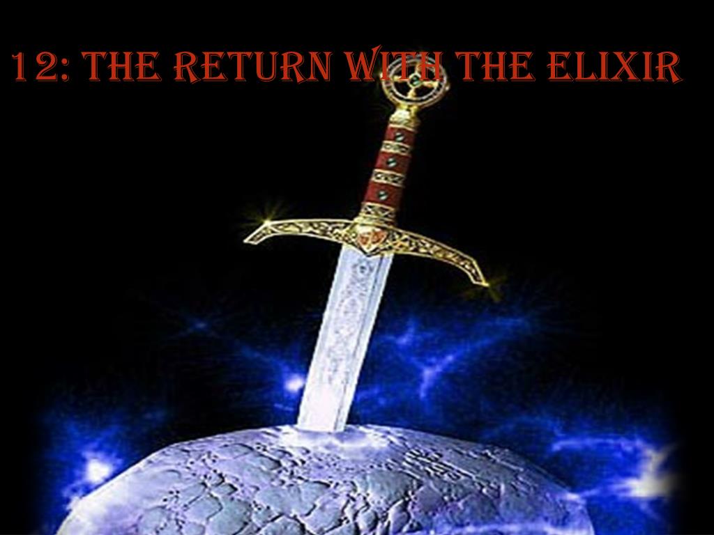 12: the return with the elixir • The Return signals a time when we distribute rewards and punishments, or celebrate the Journey’s end with revelry or marriage. • In most tales, the Return with the Elixir completes the cycle of this particular Journey. Story lines have been resolved, balance has been restored to the Ordinary World, and the Hero may now embark on a new life, forever influenced by the Journey travelled.