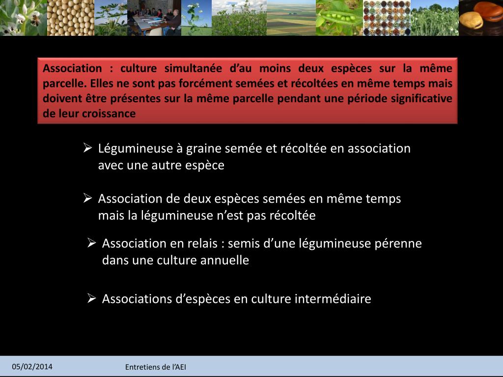 Association : culture simultanée d’au moins deux espèces sur la même parcelle. Elles ne sont pas forcément semées et récoltées en même temps mais doivent être présentes sur la même parcelle pendant une période significative de leur croissance • Légumineuse à graine semée et récoltée en association avec une autre espèce • Association de deux espèces semées en même temps mais la légumineuse n’est pas récoltée • Association en relais : semis d’une légumineuse pérenne dans une culture annuelle • Associations d’espèces en culture intermédiaire