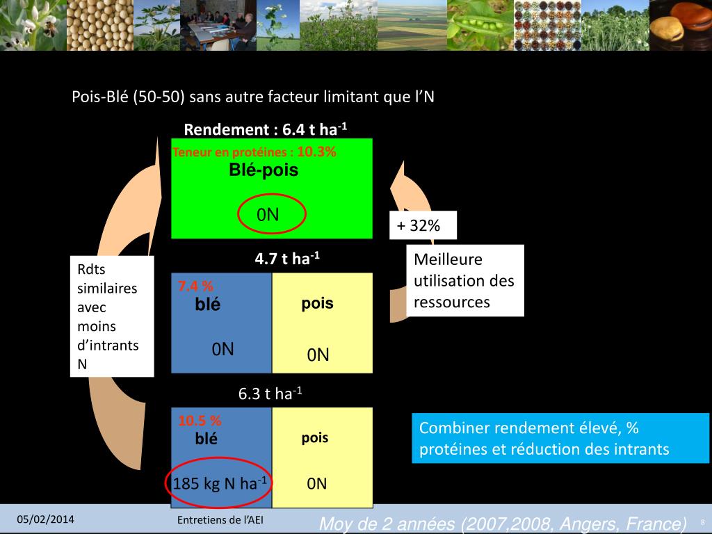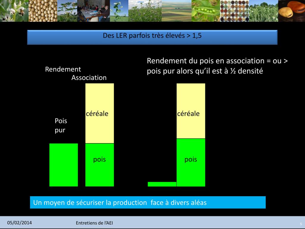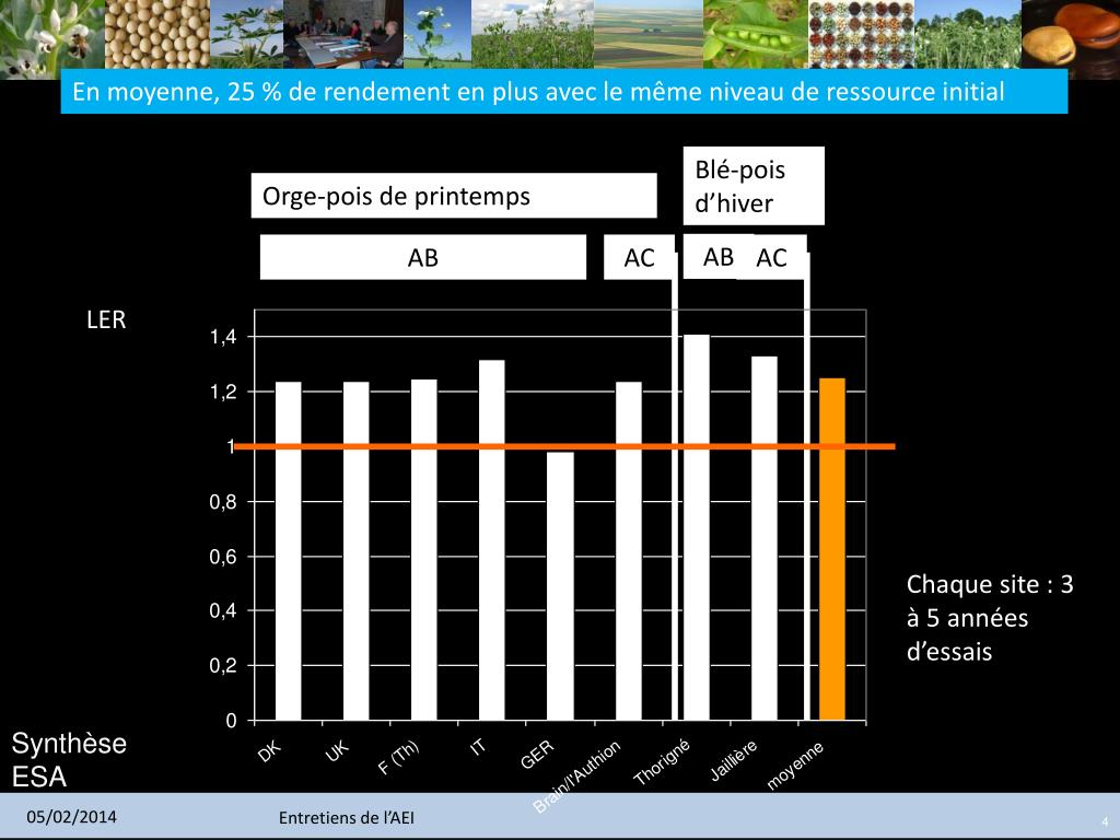 En moyenne, 25 % de rendement en plus avec le même niveau de ressource initial Blé-pois d’hiver Orge-pois de printemps AB AB AC AC LER Chaque site : 3 à 5 années d’essais Synthèse ESA 4