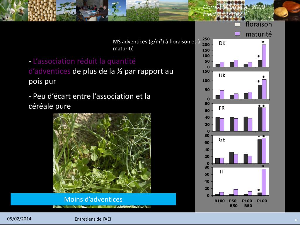 DK UK FR GE IT * * * * * * * * * * Corre-Hellou et al, 2009 Field Crop Res floraison maturité MS adventices (g/m²) à floraison et à maturité - L’association réduit la quantité d’adventices de plus de la ½ par rapport au pois pur - Peu d’écart entre l’association et la céréale pure Moins d’adventices 6