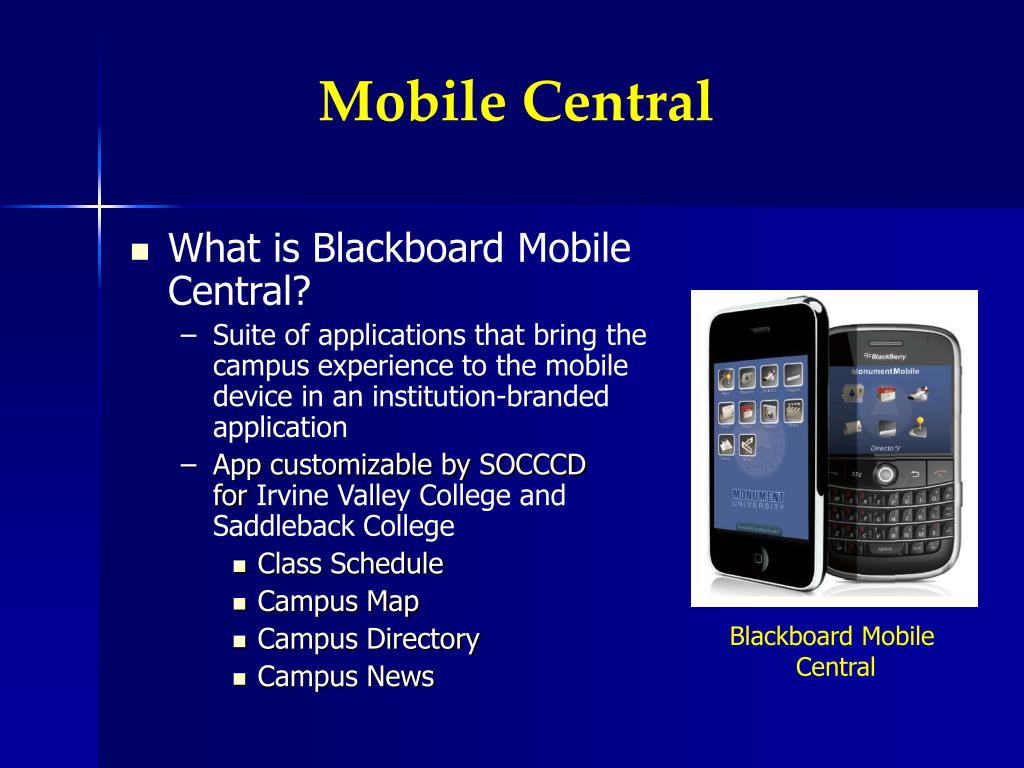 Mobile Central • What is Blackboard Mobile Central? • Suite of applications that bring the campus experience to the mobile device in an institution-branded application • App customizable by SOCCCDfor Irvine Valley College and Saddleback College • Class Schedule • Campus Map • Campus Directory • Campus News Blackboard Mobile Central