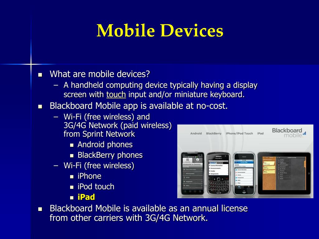 Mobile Devices • What are mobile devices? • A handheld computing device typically having a display screen with touch input and/or miniature keyboard. • Blackboard Mobile app is available at no-cost. • Wi-Fi (free wireless) and 3G/4G Network (paid wireless)from Sprint Network • Android phones • BlackBerry phones • Wi-Fi (free wireless) • iPhone • iPod touch • iPad • Blackboard Mobile is available as an annual license from other carriers with 3G/4G Network.