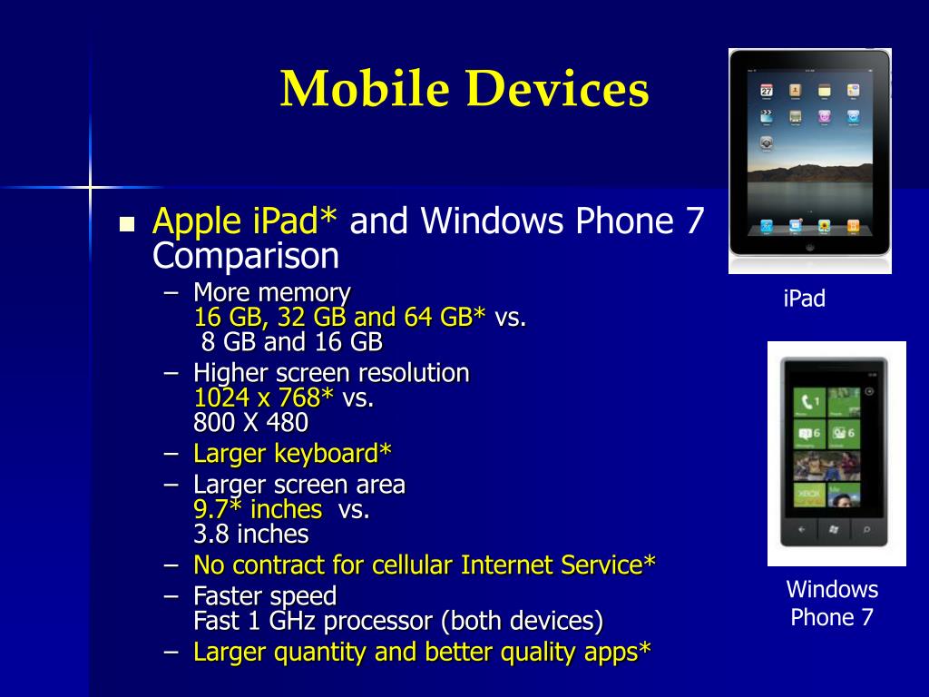 Mobile Devices • Apple iPad* and Windows Phone 7 Comparison • More memory 16 GB, 32 GB and 64 GB* vs. 8 GB and 16 GB • Higher screen resolution 1024 x 768* vs. 800 X 480 • Larger keyboard* • Larger screen area 9.7* inches vs. 3.8 inches • No contract for cellular Internet Service* • Faster speed Fast 1 GHz processor (both devices) • Larger quantity and better quality apps* iPad Windows Phone 7