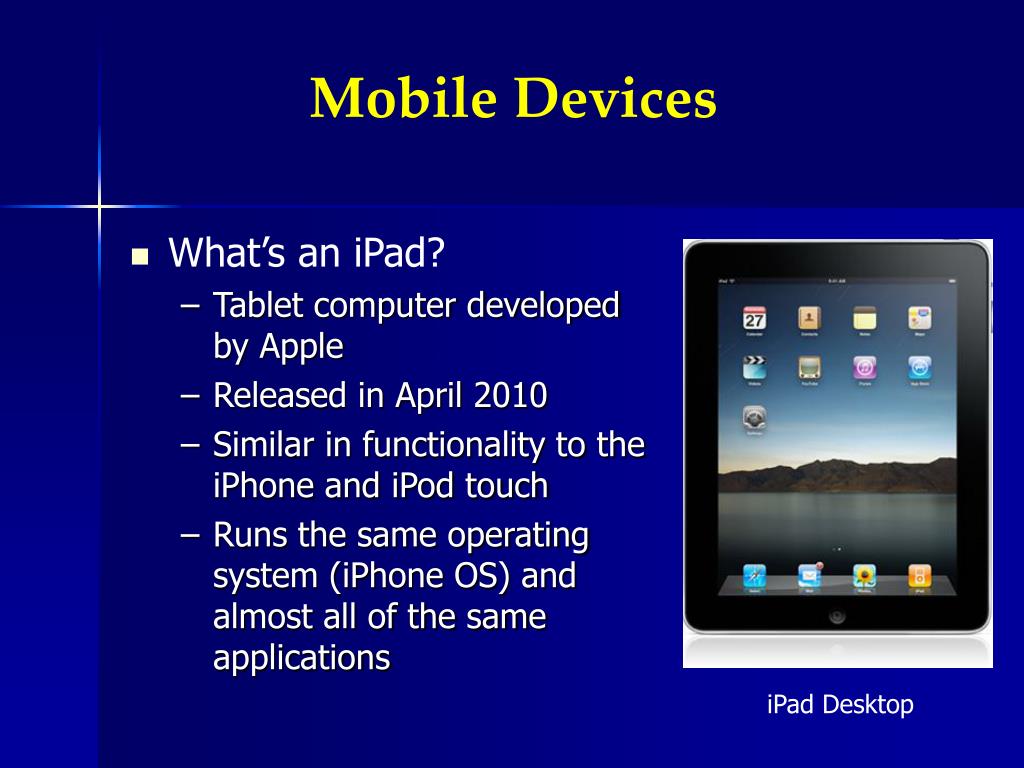 Mobile Devices • What’s an iPad? • Tablet computer developed by Apple • Released in April 2010 • Similar in functionality to the iPhone and iPod touch • Runs the same operating system (iPhone OS) and almost all of the same applications iPad Desktop