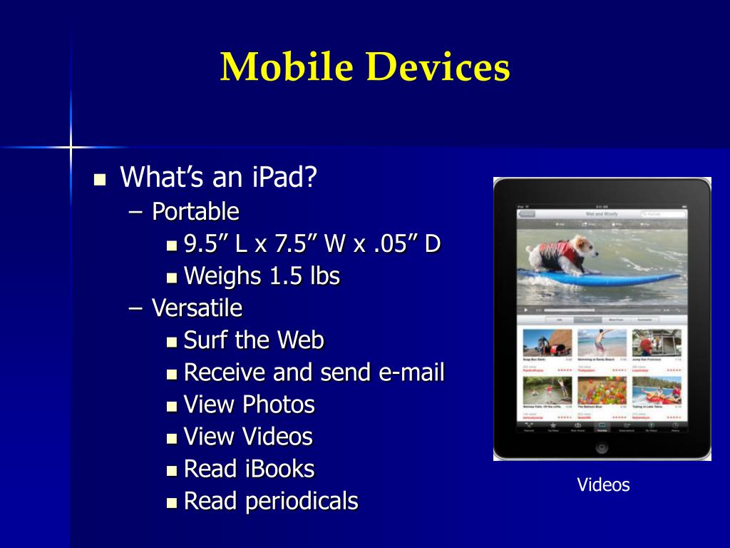 Mobile Devices • What’s an iPad? • Portable • 9.5” L x 7.5” W x .05” D • Weighs 1.5 lbs • Versatile • Surf the Web • Receive and send e-mail • View Photos • View Videos • Read iBooks • Read periodicals Videos
