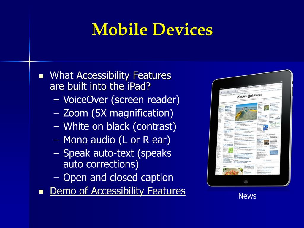 Mobile Devices • What Accessibility Featuresare built into the iPad? • VoiceOver (screen reader) • Zoom (5X magnification) • White on black (contrast) • Mono audio (L or R ear) • Speak auto-text (speaksauto corrections) • Open and closed caption • Demo of Accessibility Features News