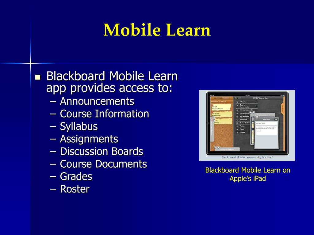 Mobile Learn • Blackboard Mobile Learn app provides access to: • Announcements • Course Information • Syllabus • Assignments • Discussion Boards • Course Documents • Grades • Roster Blackboard Mobile Learn on Apple’s iPad