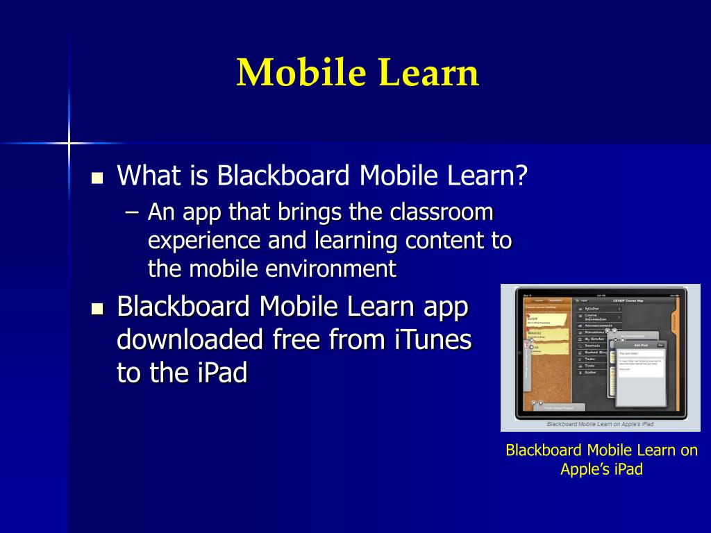 Mobile Learn • What is Blackboard Mobile Learn? • An app that brings the classroom experience and learning content to the mobile environment • Blackboard Mobile Learn app downloaded free from iTunes to the iPad Blackboard Mobile Learn on Apple’s iPad