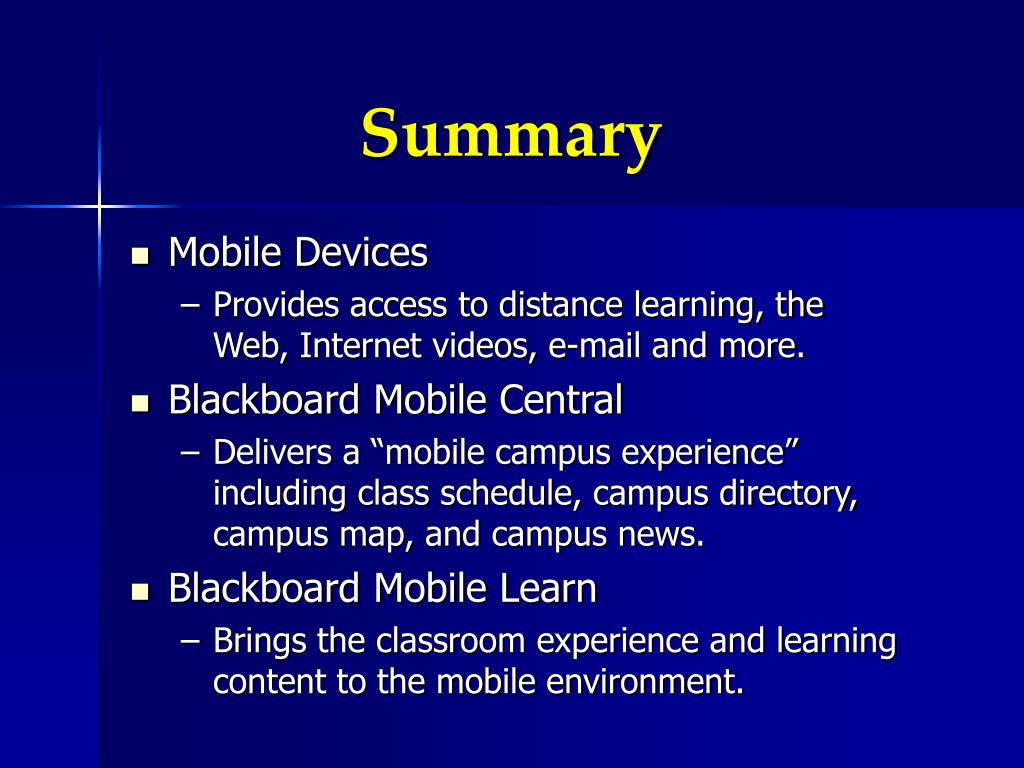 Summary • Mobile Devices • Provides access to distance learning, the Web, Internet videos, e-mail and more. • Blackboard Mobile Central • Delivers a “mobile campus experience” including class schedule, campus directory, campus map, and campus news. • Blackboard Mobile Learn • Brings the classroom experience and learning content to the mobile environment.