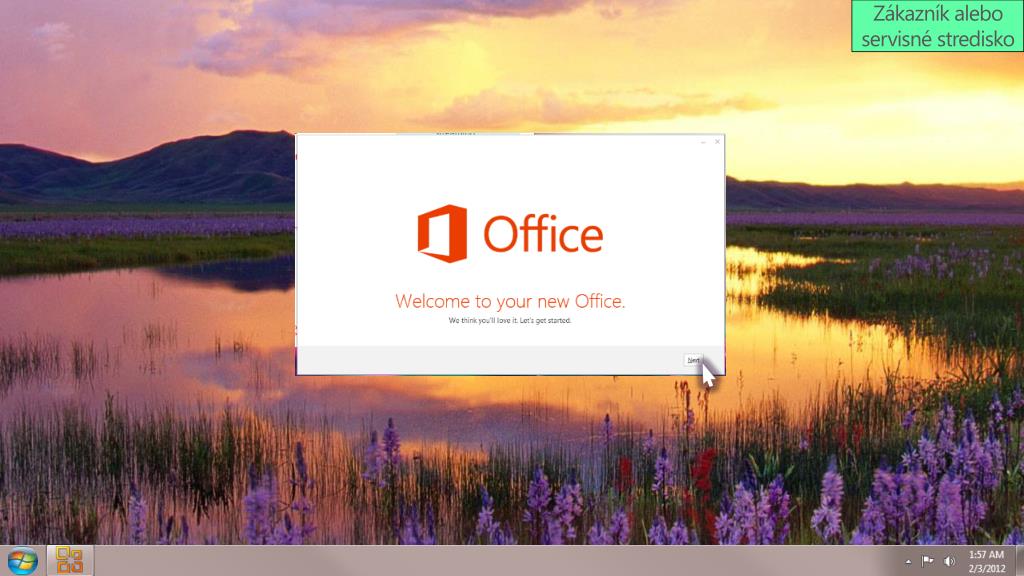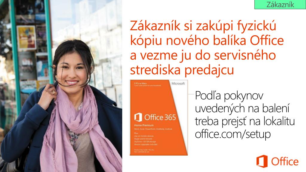 Zákazník Zákazník si zakúpi fyzickú kópiu nového balíka Office a vezme ju do servisného strediska predajcu Podľa pokynov uvedených na balení treba prejsť na lokalitu office.com/setup