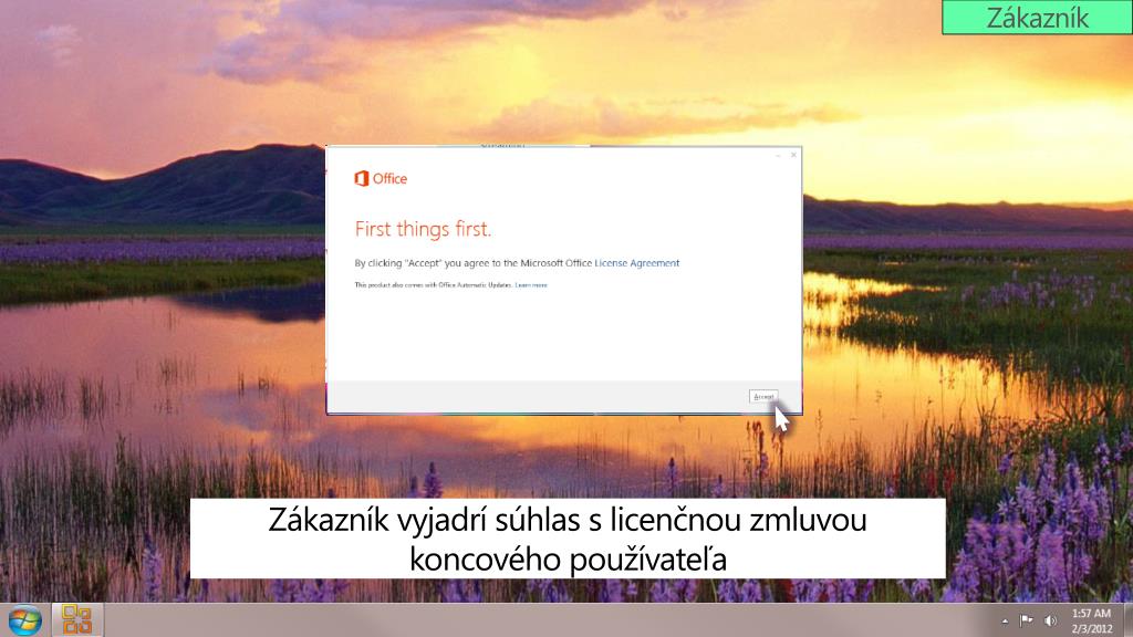 Zákazník Inštaláciabalíka Office http://www.office.com/steup Office – Microsoft Office Hlavné trendy a ciele O15 Poznámka: Obdobie predplatného balíka Office začne po kliknutí na tlačidlo Pokračovať Vybertejazykproduktu a vyjadriteexplicitnýsúhlasso zásadamiochranyosobnýchúdajov