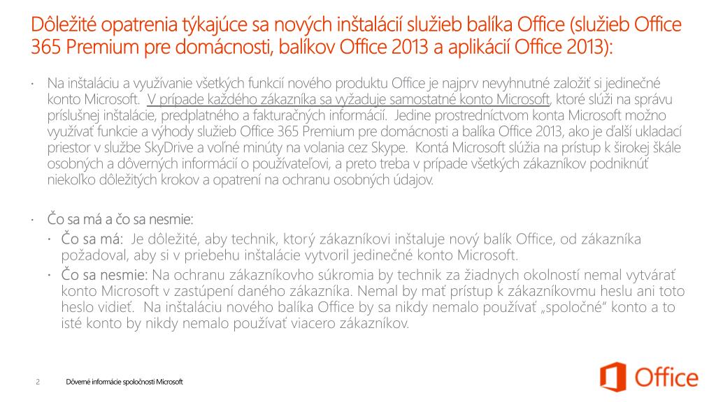 Dôležitéopatreniatýkajúcesanovýchinštaláciíslužiebbalíka Office (služieb Office 365 Premium pre domácnosti, balíkov Office 2013 a aplikácií Office 2013): • Na inštaláciu a využívanievšetkýchfunkciínovéhoproduktu Office je najprvnevyhnutnézaložiťsijedinečnékonto Microsoft. V prípadekaždéhozákazníkasavyžadujesamostatnékonto Microsoft, ktoréslúžinasprávupríslušnejinštalácie, predplatného a fakturačnýchinformácií. Jedineprostredníctvomkonta Microsoft možnovyužívaťfunkcie a výhodyslužieb Office 365 Premium pre domácnosti a balíka Office 2013, ako je ďalšíukladacípriestor v službe SkyDrive a voľnéminútynavolaniacez Skype. Kontá Microsoft slúžianaprístup k širokejškáleosobných a dôvernýchinformácií o používateľovi, a pretotreba v prípadevšetkýchzákazníkovpodniknúťniekoľkodôležitýchkrokov a opatrenínaochranuosobnýchúdajov. • Čosamá a čosanesmie: • Čosamá: Je dôležité, abytechnik, ktorýzákazníkoviinštalujenovýbalík Office, od zákazníkapožadoval, abysi v priebehuinštalácievytvoriljedinečnékonto Microsoft. • Čosanesmie: Na ochranuzákazníkovhosúkromia by technikzažiadnychokolnostínemalvytváraťkonto Microsoft v zastúpenídanéhozákazníka. Nemal by maťprístup k zákazníkovmuhesluanitotoheslovidieť. Na inštaláciunovéhobalíka Office by sanikdynemalopoužívať „spoločné“ konto a to istékonto by nikdynemalopoužívaťviacerozákazníkov.