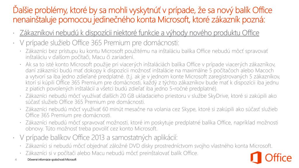 Ďalšieproblémy, ktoré by samohlivyskytnúť v prípade, žesanovýbalík Office nenainštalujepomocoujedinečnéhokonta Microsoft, ktorézákazníkpozná: • Zákazníkovinebudú k dispozíciiniektoréfunkcie a výhodynovéhoproduktu Office • V prípadeslužieb Office 365 Premium pre domácnosti: • Zákaznícibezprístupukukontu Microsoft použitémunainštaláciubalíka Office nebudúmôcťspravovaťinštaláciu v ďalšompočítači, Macučizariadení. • Aksa to istékonto Microsoft použijepriviacerýchinštaláciáchbalíka Office v prípadeviacerýchzákazníkov, danízákaznícibudúmaťdokopy k dispozíciimožnosťinštalácienamaximálne 5 počítačochaleboMacoch a vytvorísaibajednozdieľanépredplatné. (t.j.ak je v jednomkonte Microsoft zaregistrovaných 5 zákazníkov, ktorísikúpili Office 365 Premium pre domácnosti, každý z týchtozákazníkovbudemať k dispozíciiibajednu z piatichpovolenýchinštalácií a všetcibudúzdieľaťibajedno 5-ročné predplatné). • Zákaznícinebudúmôcťvyužívaťďalších 20 GB ukladaciehopriestoru v službe SkyDrive, ktorésizakúpiliakosúčasťslužieb Office 365 Premium pre domácnosti. • Zákaznícinebudúmôcťvyužívať 60 minútmesačnenavolaniacez Skype, ktorésizakúpiliakosúčasťslužieb Office 365 Premium pre domácnosti. • Zákaznícinebudúmôcťspravovaťmožnosti, ktoréimposkytujepredplatnébalíka Office, napríkladmožnostiobnovy. Tútomožnosťtrebapovoliťcezkonto Microsoft. • V prípadebalíkov Office 2013 a samostatnýchaplikácií: • Zákaznícisinebudúmôcťobjednaťzáložné DVD diskyprostredníctvomsvojhovlastnéhokonta Microsoft. • Zákaznícisi v počítačialeboMacunebudúmôcťpreinštalovaťbalík Office.
