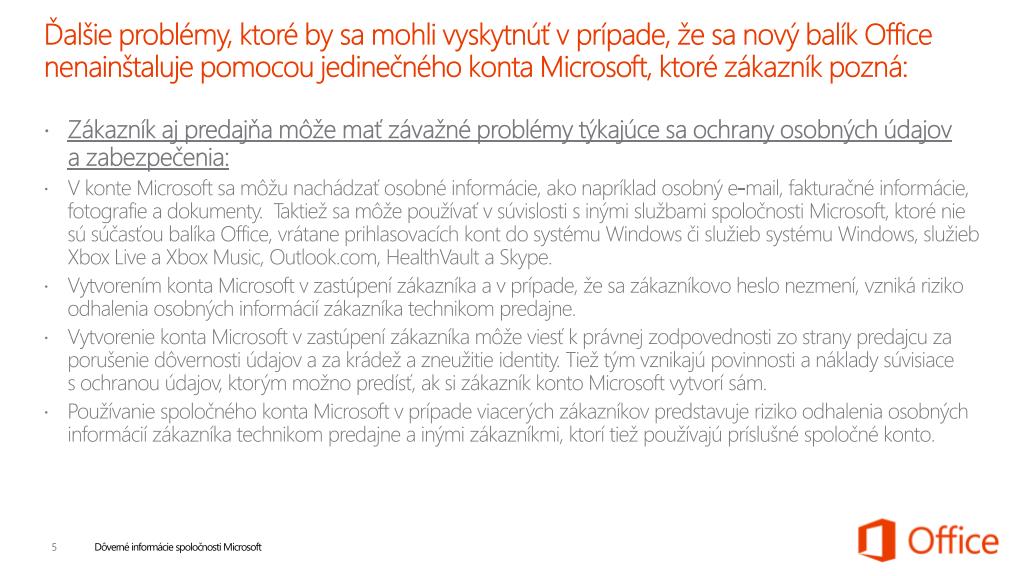 Čo ak sa nový balík Office nenainštaluje pomocou konta Microsoft, ktoré je jedinečné a ktoré zákazník pozná? • Ak sa nový balík Office nainštaluje pomocou konta Microsoft, ktoré nepatrí príslušnému zákazníkovi a ktorého poverenia zákazník nepozná, Microsoft nebude môcť zákazníkovi vytvoriť nové poverenia ani mu pomôcť. • Technická podpora spoločnosti Microsoft nebude mať inú možnosť, ako zákazníka odkázať na predajňu, kde si daný balík Office kúpil. Nový balík Office zákazníkovi neposkytuje iné východisko než balík Office preinštalovať pomocou nového kódu Product Key na náklady príslušnej predajne. • V prípade, že predajňa využije alebo si ponechá informácie o zákazníkovi, môže niesť zodpovednosť za porušenie dôvernosti údajov a za krádež a zneužitie identity. • Preto by konto Microsoft nemal v zastúpení zákazníka vytvárať technik predajne a na inštaláciu by sa nikdy nemalo používať spoločné konto Microsoft vo vlastníctve predajne.