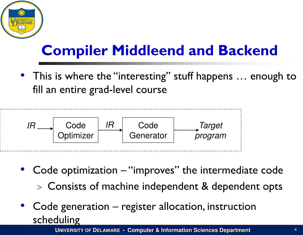 Compiler Middleend and Backend • This is where the “interesting” stuff happens … enough to fill an entire grad-level course • Code optimization – “improves” the intermediate code • Consists of machine independent & dependent opts • Code generation – register allocation, instruction scheduling IR Code Optimizer IR Code Generator Target program