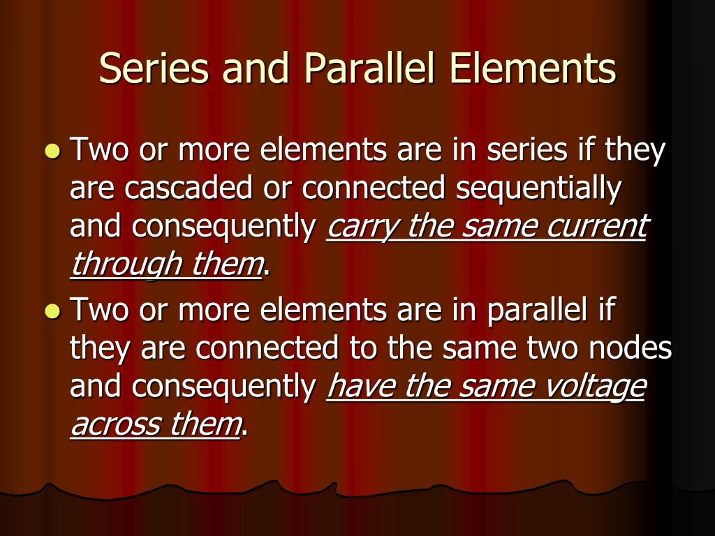Series and Parallel Elements. Equivalent Resistance. Series and Parallel Elements. Two or more elements are in series if they are cascaded or connected sequentially and consequently carry the same current through them .