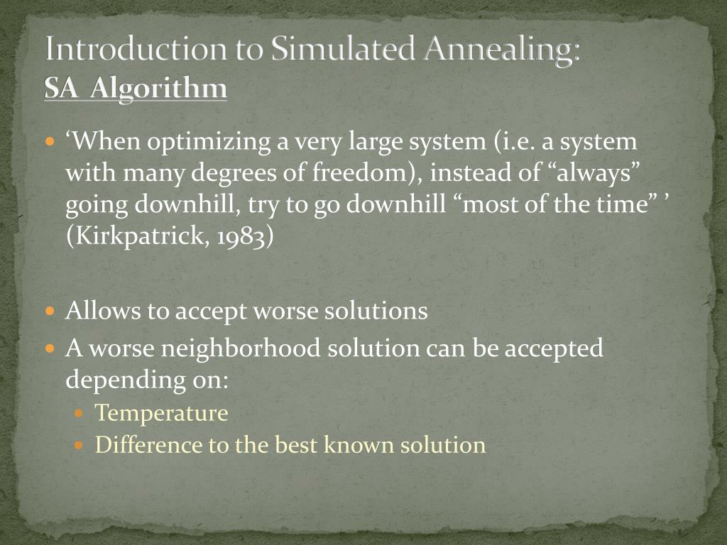 Introduction to Simulated Annealing: SA Algorithm • ‘When optimizing a very large system (i.e. a system with many degrees of freedom), instead of “always” going downhill, try to go downhill “most of the time” ’ (Kirkpatrick, 1983) • Allows to accept worse solutions • A worse neighborhood solution can be accepted depending on: • Temperature • Difference to the best known solution