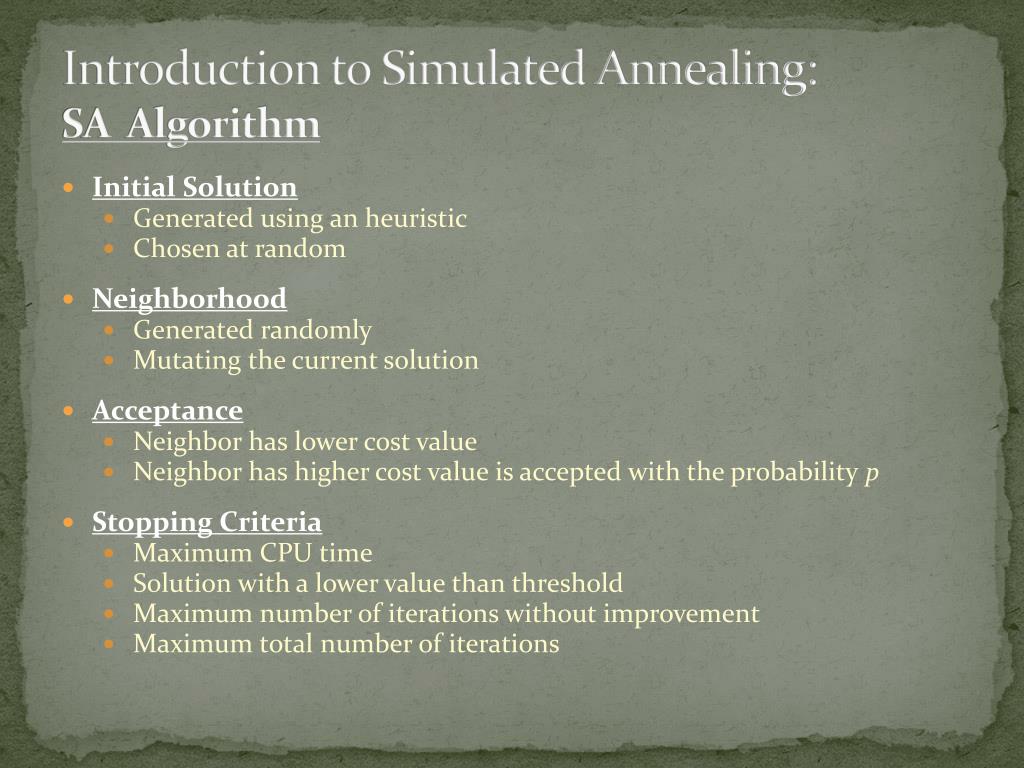 Introduction to Simulated Annealing: SA Algorithm • Initial Solution • Generated using an heuristic • Chosen at random • Neighborhood • Generated randomly • Mutating the current solution • Acceptance • Neighbor has lower cost value • Neighbor has higher cost value is accepted with the probability p • Stopping Criteria • Maximum CPU time • Solution with a lower value than threshold • Maximum number of iterations without improvement • Maximum total number of iterations