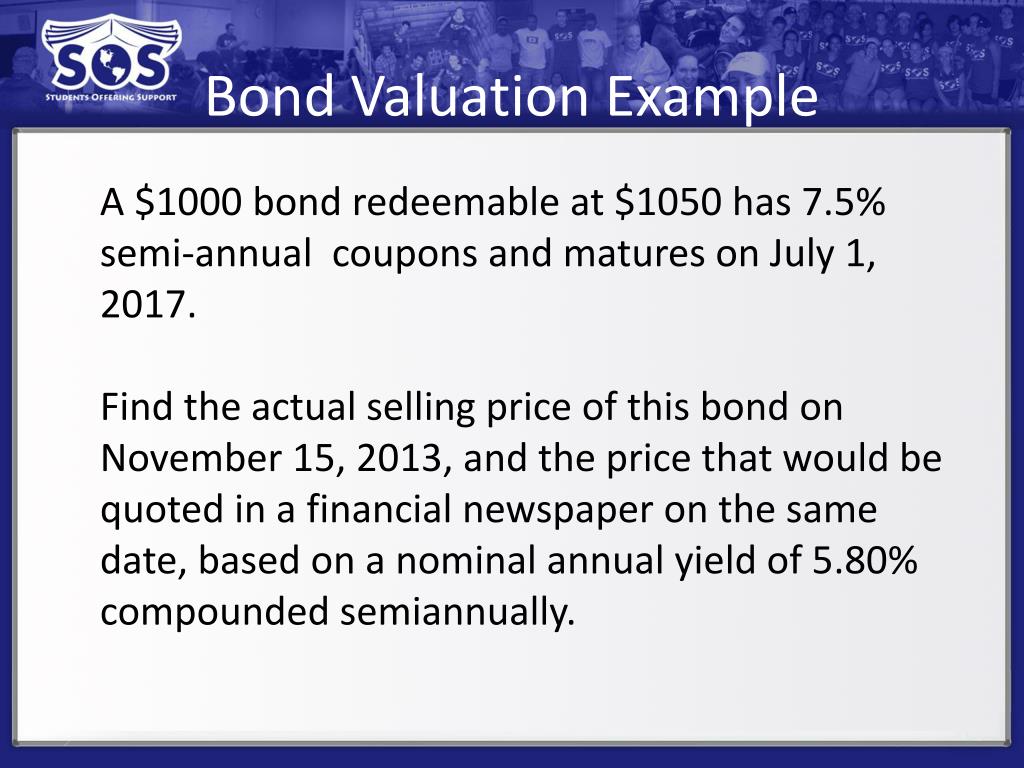 Bond Valuation Example A $1000 bond redeemable at $1050 has 7.5% semi-annual coupons and matures on July 1, 2017. Find the actual selling price of this bond on November 15, 2013, and the price that would be quoted in a financial newspaper on the same date, based on a nominal annual yield of 5.80% compounded semiannually.