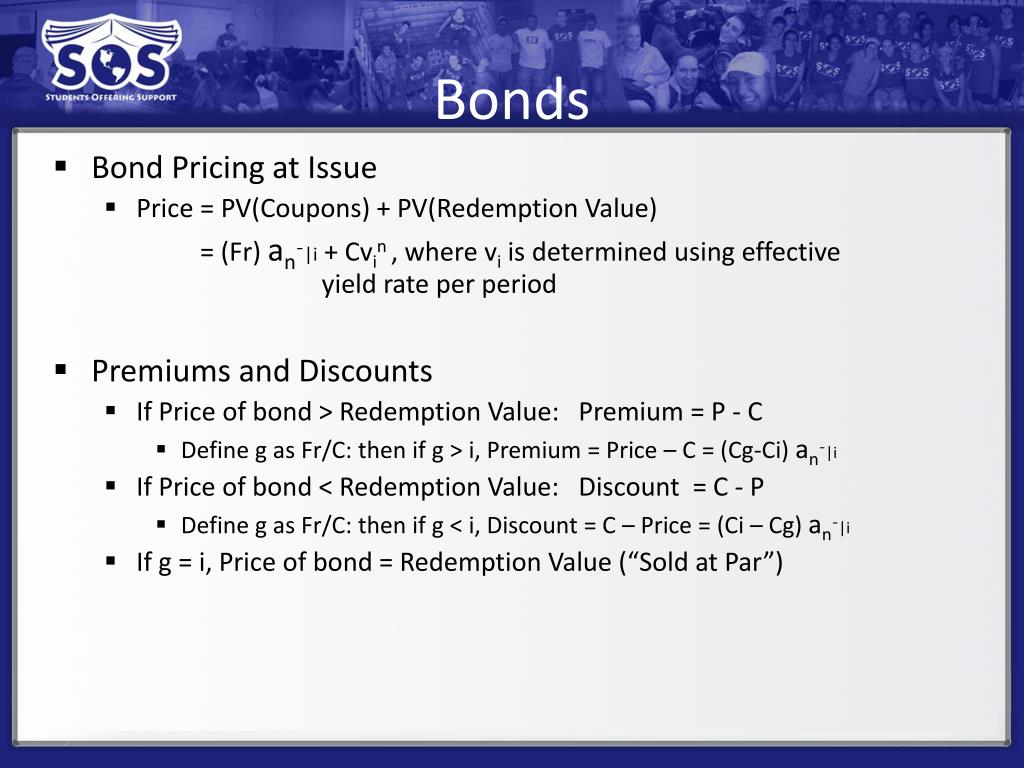 Bonds • Bond Pricing at Issue • Price = PV(Coupons) + PV(Redemption Value) = (Fr) an¯|i + Cvin , where vi is determined using effective yield rate per period • Premiums and Discounts • If Price of bond > Redemption Value: Premium = P - C • Define g as Fr/C: then if g > i, Premium = Price – C = (Cg-Ci) an¯|i • If Price of bond < Redemption Value: Discount = C - P • Define g as Fr/C: then if g < i, Discount = C – Price = (Ci – Cg) an¯|i • If g = i, Price of bond = Redemption Value (“Sold at Par”)