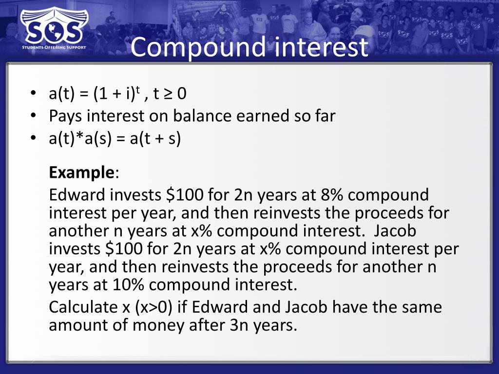 Compound interest • a(t) = (1 + i)t , t ≥ 0 • Pays interest on balance earned so far • a(t)*a(s) = a(t + s) Example: Edward invests $100 for 2n years at 8% compound interest per year, and then reinvests the proceeds for another n years at x% compound interest. Jacob invests $100 for 2n years at x% compound interest per year, and then reinvests the proceeds for another n years at 10% compound interest. Calculate x (x>0) if Edward and Jacob have the same amount of money after 3n years.