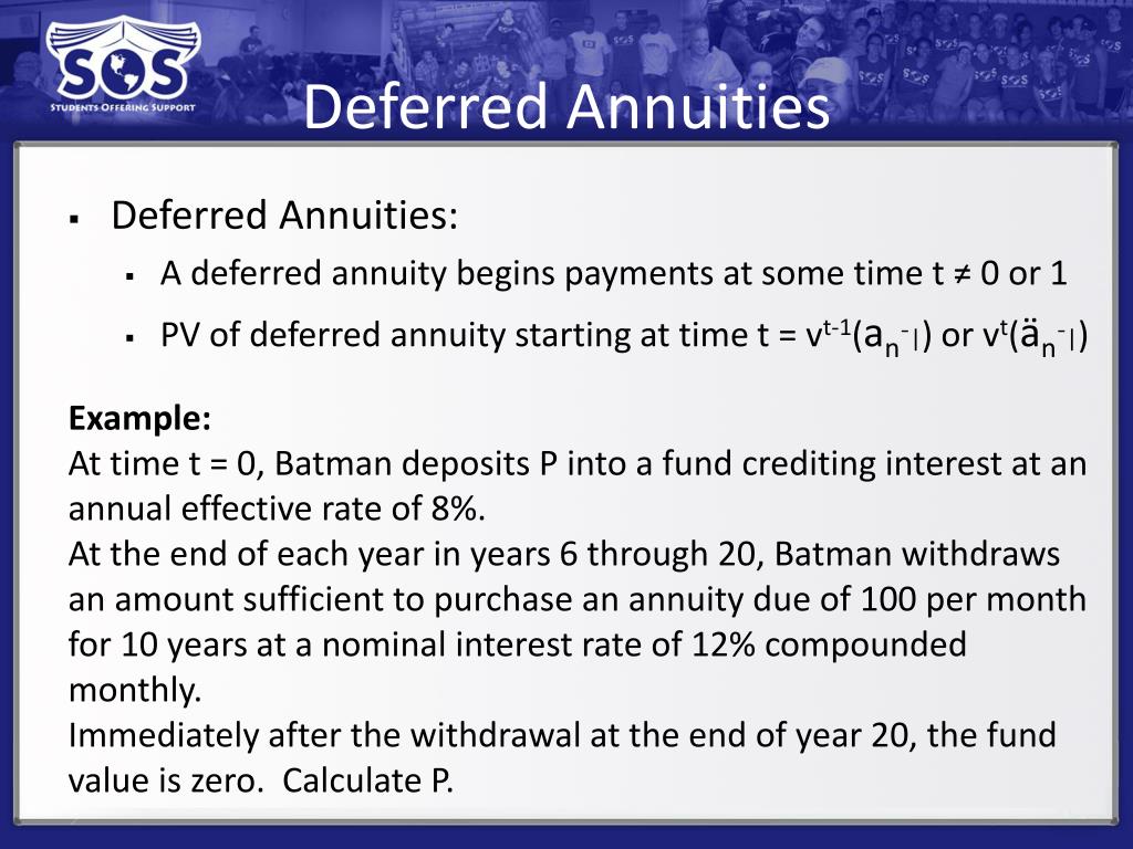 Deferred Annuities • Deferred Annuities: • A deferred annuity begins payments at some time t ≠ 0 or 1 • PV of deferred annuity starting at time t = vt-1(an¯|) or vt(än¯|) • Example: • At time t = 0, Batman deposits P into a fund crediting interest at an annual effective rate of 8%. • At the end of each year in years 6 through 20, Batman withdraws an amount sufficient to purchase an annuity due of 100 per month for 10 years at a nominal interest rate of 12% compounded monthly. • Immediately after the withdrawal at the end of year 20, the fund value is zero. Calculate P.