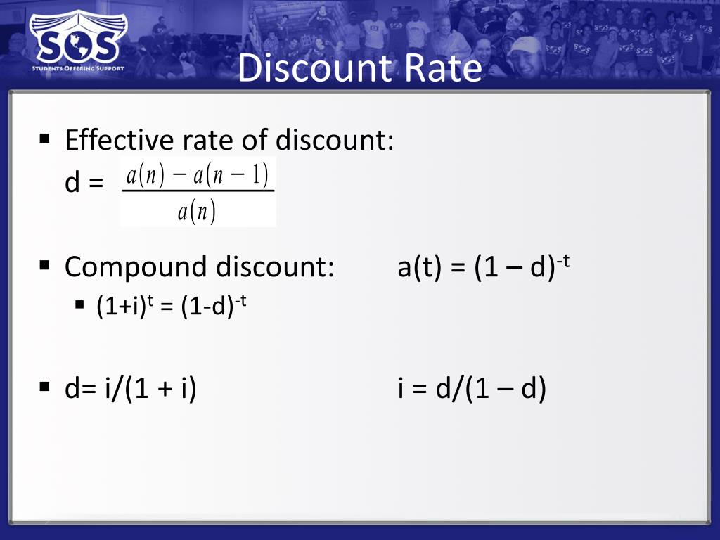 Discount Rate • Effective rate of discount: d = • Compound discount: a(t) = (1 – d)-t • (1+i)t = (1-d)-t • d= i/(1 + i) i = d/(1 – d)