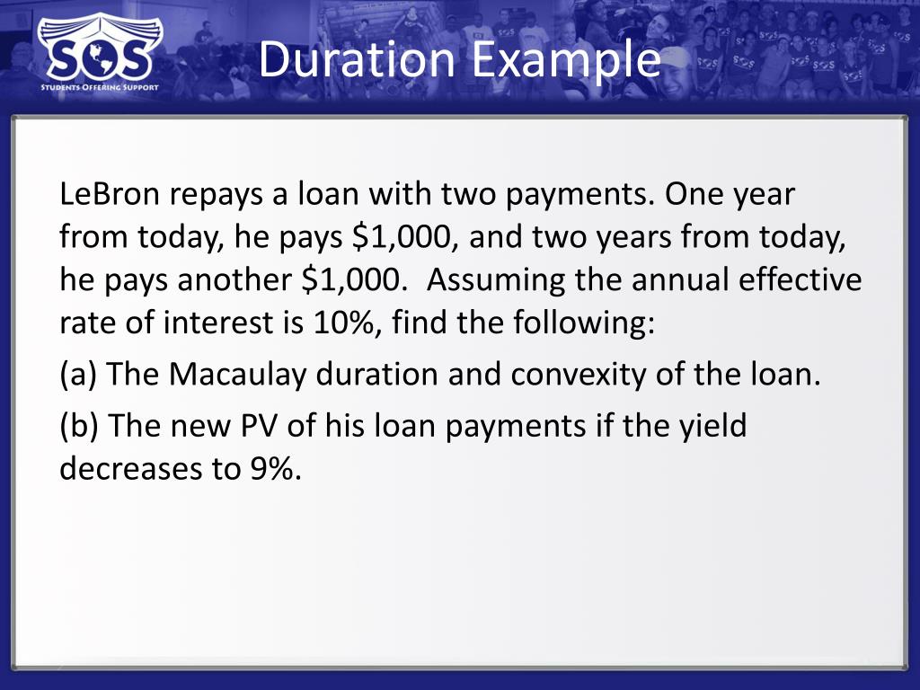 Duration Example LeBron repays a loan with two payments. One year from today, he pays $1,000, and two years from today, he pays another $1,000. Assuming the annual effective rate of interest is 10%, find the following: (a) The Macaulay duration and convexity of the loan. (b) The new PV of his loan payments if the yield decreases to 9%.