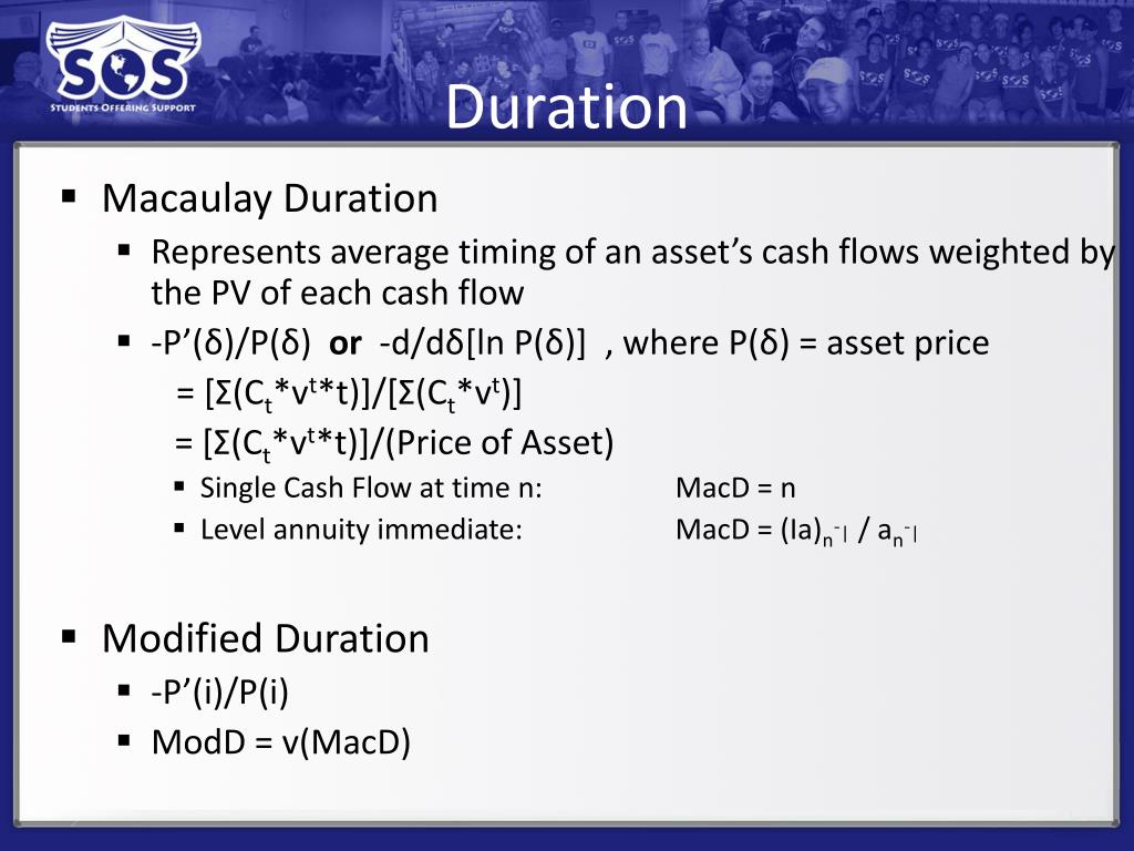 Duration • Macaulay Duration • Represents average timing of an asset’s cash flows weighted by the PV of each cash flow • -P’(δ)/P(δ) or -d/dδ[ln P(δ)] , where P(δ) = asset price = [Σ(Ct*vt*t)]/[Σ(Ct*vt)] = [Σ(Ct*vt*t)]/(Price of Asset) • Single Cash Flow at time n: MacD = n • Level annuity immediate: MacD = (Ia)n¯| / an¯| • Modified Duration • -P’(i)/P(i) • ModD= v(MacD)