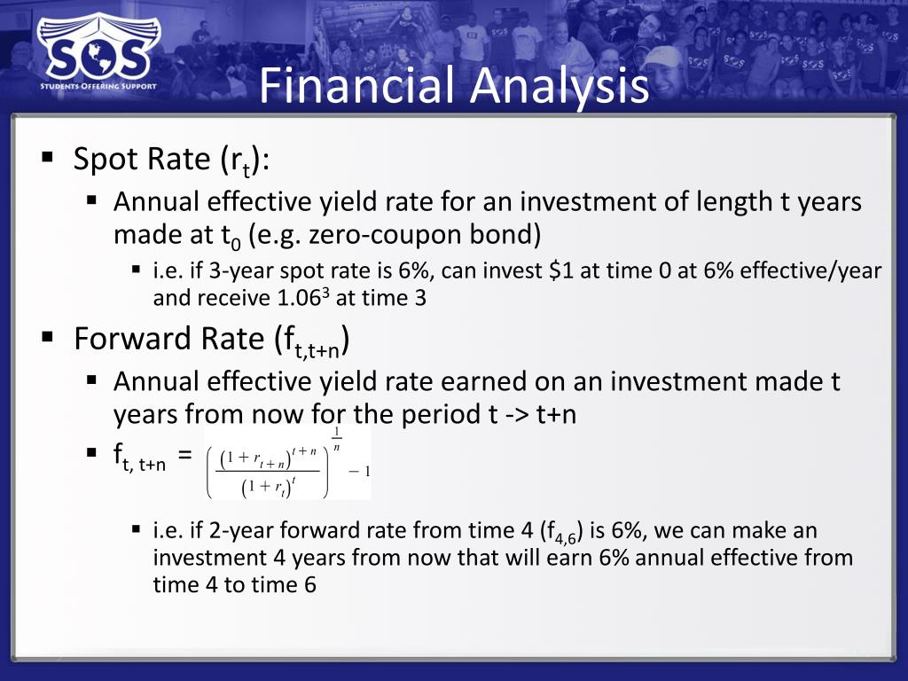 Financial Analysis • Spot Rate (rt): • Annual effective yield rate for an investment of length t years made at t0 (e.g. zero-coupon bond) • i.e. if 3-year spot rate is 6%, can invest $1 at time 0 at 6% effective/year and receive 1.063 at time 3 • Forward Rate (ft,t+n) • Annual effective yield rate earned on an investment made t years from now for the period t -> t+n • ft, t+n= • i.e. if 2-year forward rate from time 4 (f4,6) is 6%, we can make an investment 4 years from now that will earn 6% annual effective from time 4 to time 6