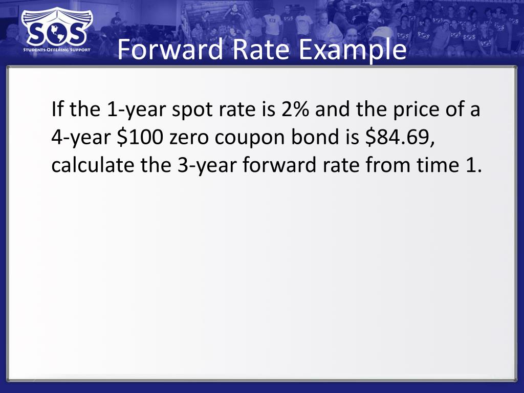 Forward Rate Example If the 1-year spot rate is 2% and the price of a 4-year $100 zero coupon bond is $84.69, calculate the 3-year forward rate from time 1.