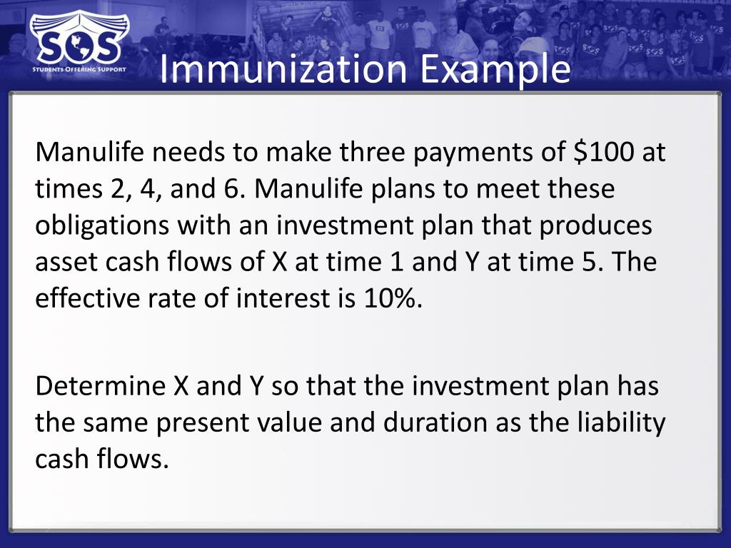 Immunization Example Manulife needs to make three payments of $100 at times 2, 4, and 6. Manulife plans to meet these obligations with an investment plan that produces asset cash flows of X at time 1 and Y at time 5. The effective rate of interest is 10%. Determine X and Y so that the investment plan has the same present value and duration as the liability cash flows.