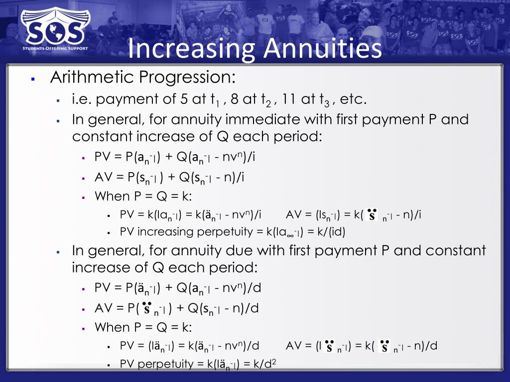 Increasing Annuities • Arithmetic Progression: • i.e. payment of 5 at t1 , 8 at t2 , 11 at t3 , etc. • In general, for annuity immediate with first payment P and constant increase of Q each period: • PV = P(an¯|) + Q(an¯| - nvn)/i • AV = P(sn¯| ) + Q(sn¯| - n)/i • When P = Q = k: • PV = k(Ian¯|) = k(än¯| - nvn)/i AV = (Isn¯|) = k( n¯| - n)/i • PV increasing perpetuity = k(Ia∞¯|) = k/(id) • In general, for annuity due with first payment P and constant increase of Q each period: • PV = P(än¯|) + Q(an¯| - nvn)/d • AV = P( n¯| ) + Q(sn¯| - n)/d • When P = Q = k: • PV = (Iän¯|) = k(än¯| - nvn)/d AV = (I n¯|) = k( n¯| - n)/d • PV perpetuity = k(Iän¯|) = k/d2