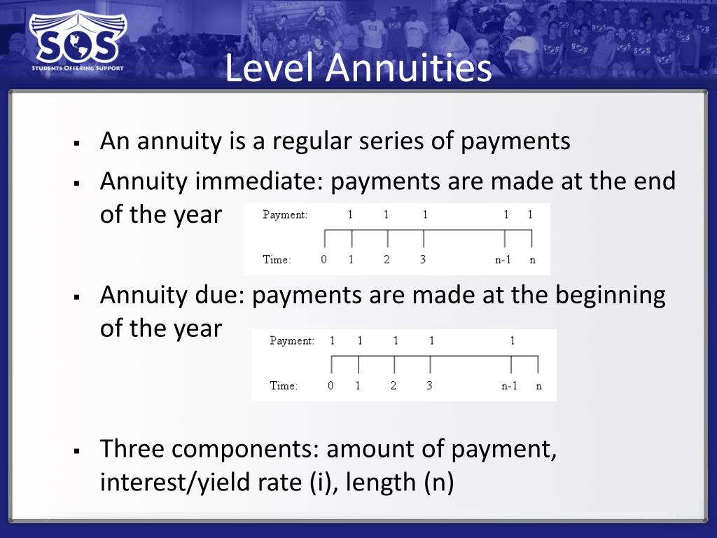 Level Annuities • An annuity is a regular series of payments • Annuity immediate: payments are made at the end of the year • Annuity due: payments are made at the beginning of the year • Three components: amount of payment, interest/yield rate (i), length (n)