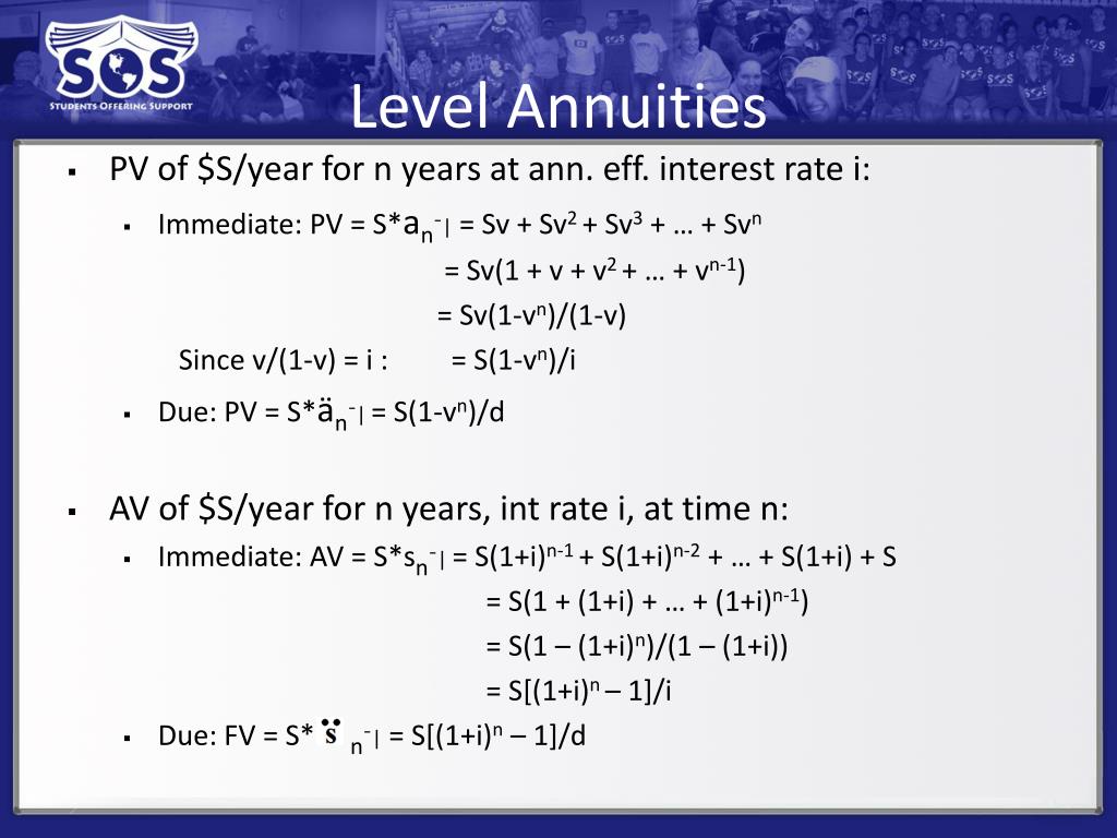 Level Annuities • PV of $S/year for n years at ann. eff. interest rate i: • Immediate: PV = S*an¯| = Sv + Sv2 + Sv3 + … + Svn = Sv(1 + v + v2 + … + vn-1) = Sv(1-vn)/(1-v) Since v/(1-v) = i : = S(1-vn)/i • Due: PV = S*än¯|= S(1-vn)/d • AV of $S/year for n years, int rate i, at time n: • Immediate: AV = S*sn¯| = S(1+i)n-1 + S(1+i)n-2 + … + S(1+i) + S = S(1 + (1+i) + … + (1+i)n-1) = S(1 – (1+i)n)/(1 – (1+i)) = S[(1+i)n – 1]/i • Due: FV = S* n¯| = S[(1+i)n – 1]/d
