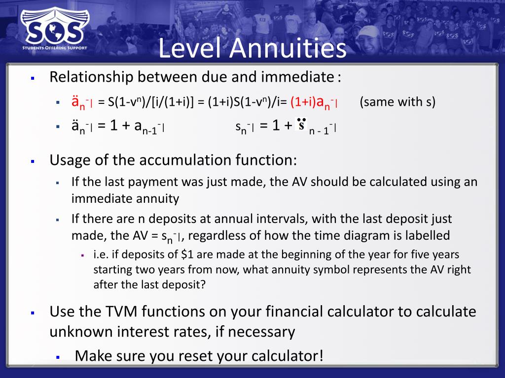 Level Annuities • Relationship between due and immediate: • än¯|= S(1-vn)/[i/(1+i)] = (1+i)S(1-vn)/i= (1+i)an¯|(same with s) • än¯| = 1 + an-1¯| sn¯| = 1 + n - 1¯| • Usage of the accumulation function: • If the last payment was just made, the AV should be calculated using an immediate annuity • If there are n deposits at annual intervals, with the last deposit just made, the AV = sn¯|, regardless of how the time diagram is labelled • i.e. if deposits of $1 are made at the beginning of the year for five years starting two years from now, what annuity symbol represents the AV right after the last deposit? • Use the TVM functions on your financial calculator to calculate unknown interest rates, if necessary • Make sure you reset your calculator!